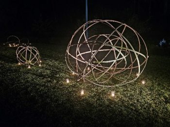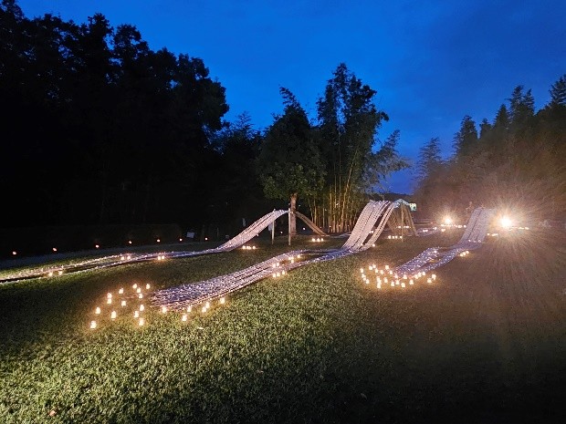 この「高山竹あかり」会場には、本学工芸学科教授の長谷川 政弘先生(金属造形作家)がデザインした竹の造形物が数多く展示されています