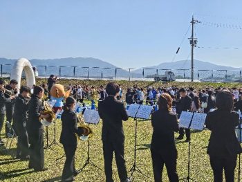 また、「新モビFESTA」と同時に開催された「南河内フルーツマラニック」(マラソン×ピクニック)も行われました。スタート位置で金管ブラスによる演奏が披露されていましたが、こちらも大阪芸術大学の演奏学科管弦打コースの学生たちでした。