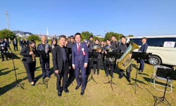 ↑吉村知事と金管ブラスの学生さん、橋爪先生、伊勢先生で記念撮影(伊勢先生より写真提供)